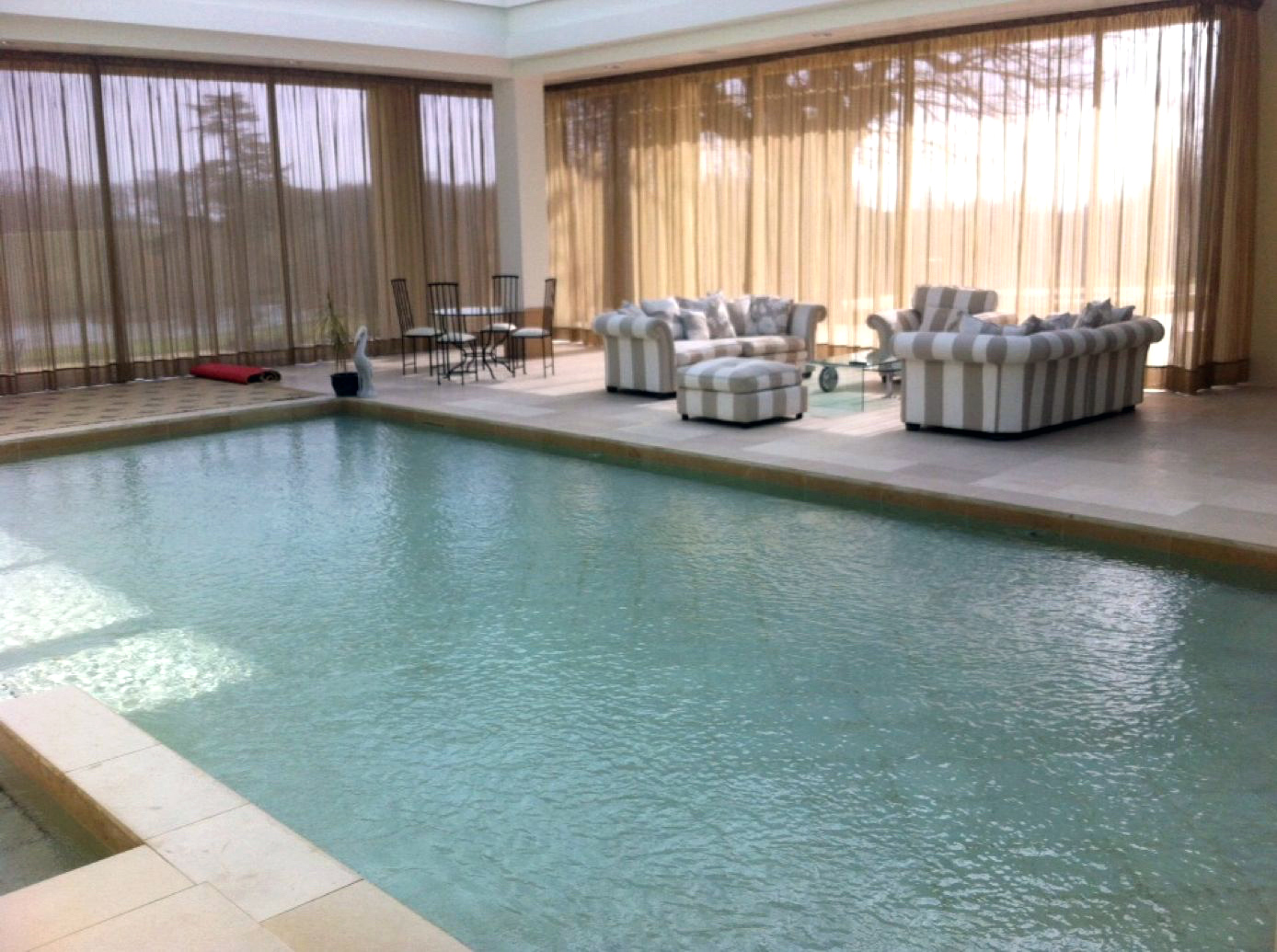 Die Immobilie befindet sich auf einem Anwesen in erhöhter Lage und bietet einen spektakulären Blick über die Gegend. Das Schwimmbad ist in einem Raum mit raumhohen Fenstern untergebracht. Diese Gegebenheit, Aussicht und Innenlage, machte den Raum äußerst attraktiv für eine Umgestaltung zu einem flexiblen Unterhaltungsbereich. Zumal die Luftfeuchtigkeit im Raum auf gleichem Niveau bliebe, wenn das Schwimmbecken abgedeckt wäre. Es bliebe kein unangenehmer Schwimmbadgeruch zurück.
